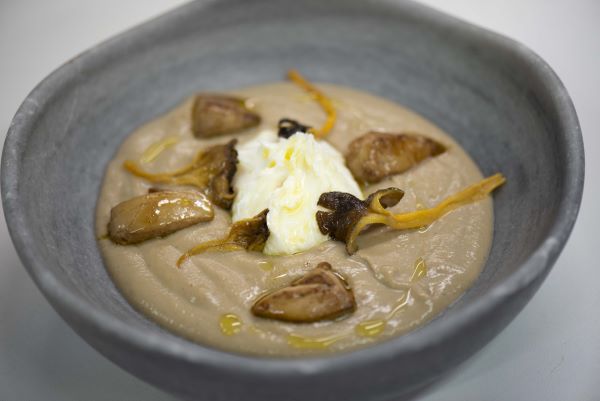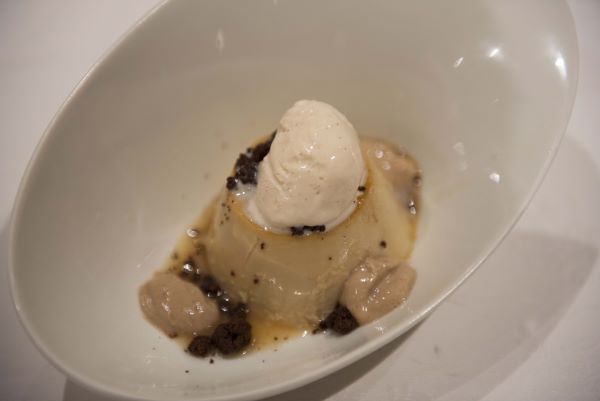 Flan de boletus, praliné de avellana y helado de queso.