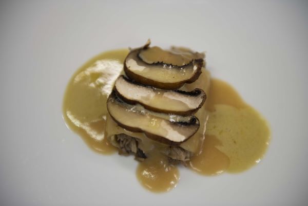 Canelón de setas y presa ibérica con foie.Merluza con duxelle de trompetilla negra, crema de chirivía y aceite