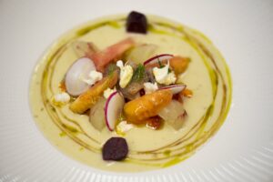 | Merluza menier con trufa negra. | Torrija de pan de calabaza con biscuit trufado y sopa de vainilla. |