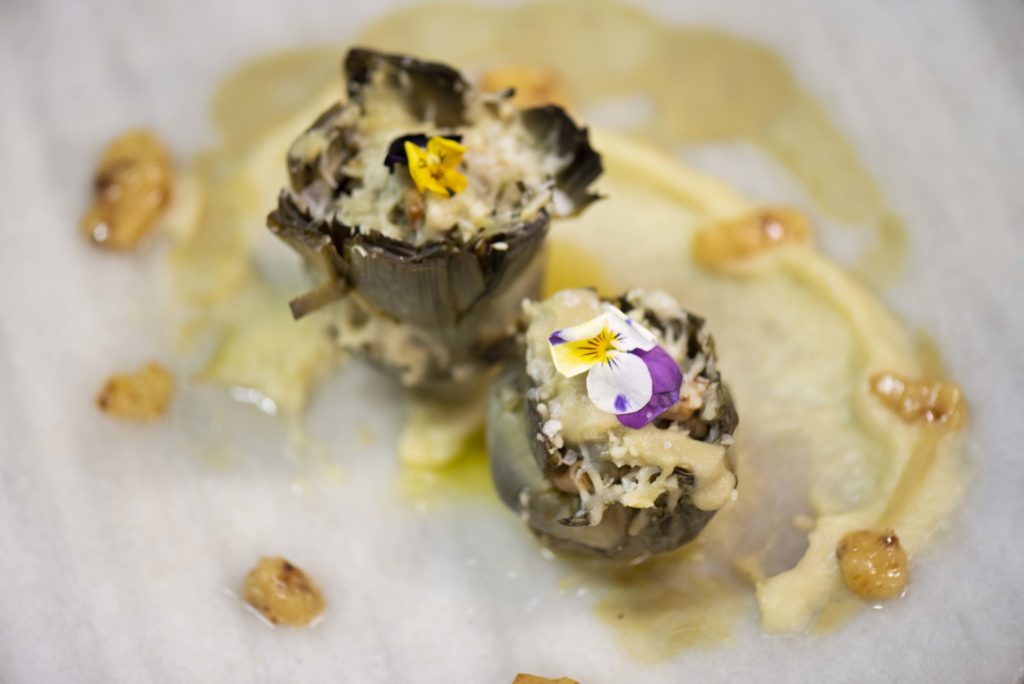 | Alcachofa rellena de foie y panceta ibérica con queso gratinado. | Alcachofa en texturas con huevo poché y jamón ibérico. |